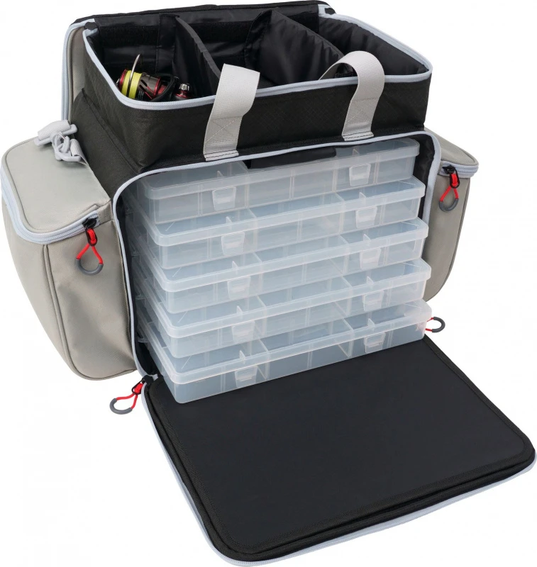 The W3 Vertical Master Bag is the perfect solution to keep everything organized. The main compartment includes lure boxes and at the front you will find a tool organizer plate to hold your tools. The top compartment has two removable and adjustable dividers. W3 Vertical Master Bag has a big mesh pockets, large side pockets for accessories, carry handles and a removable, padded shoulder strap.55 x 25 x 37 cmMaterial: 660D/210D Diamond Pattern Polyester with coating5 boxes (35 x 22 x 5cm) includedWater resistant materialsTop compartment with 2 adjustable dividersTool holder plate2 large side pockets2 large mesh pocketsInterior tool-holder front platePadded carry handle and removable padded shoulder strapReinforced and water resistant bottomOversized zipper
